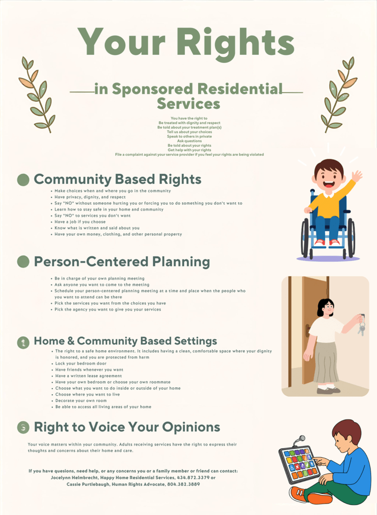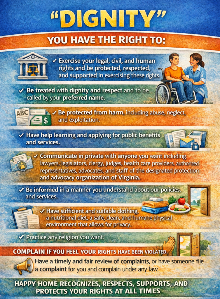 Happy Home and all sponsored homes are trained and understand the importance of protecting, honoring, and preserving the rights of our residents. If an individual, family, or friend believes a resident’s human rights have been offered, restricted improperly, or violated—including concerns related to dignity, privacy, choice, safety, or freedom from abuse, neglect, or exploitation—they have the right to report the concern without fear of retaliation.